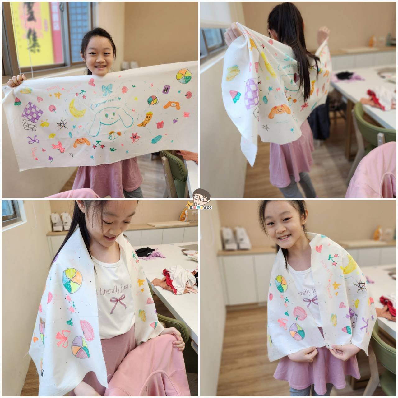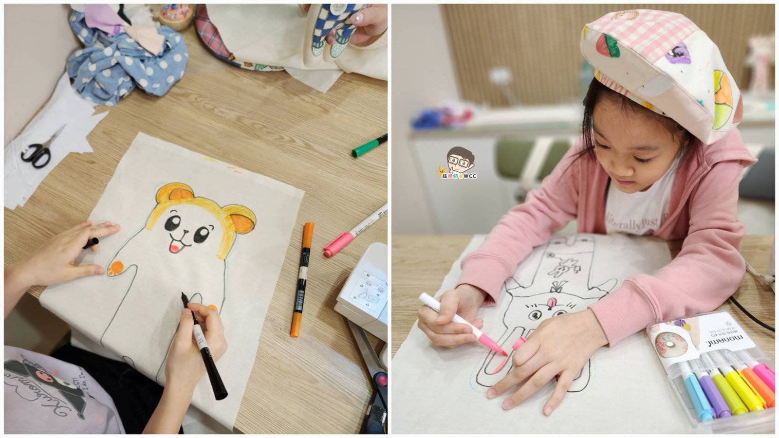 孩子可以體驗自己設計塗鴉布料,到不同布料的拼接,到完成藝術家貝雷帽成品