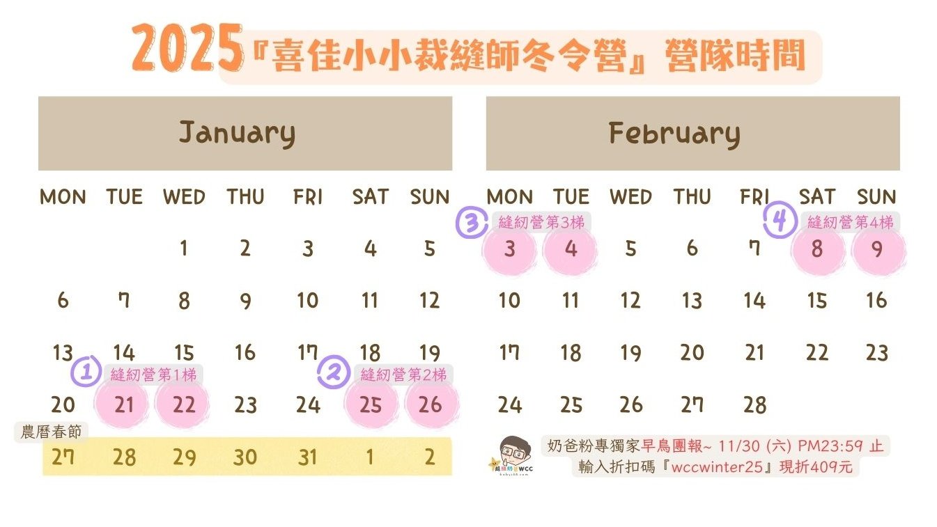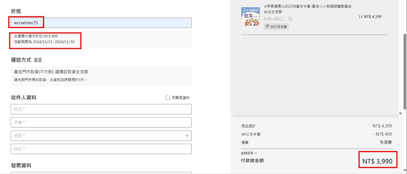 課程原價4890元,輸入折扣碼『wccwinter25』現折409元,早鳥團報價只要3990元,團報 ~ 11/30 (六) PM23:59 止