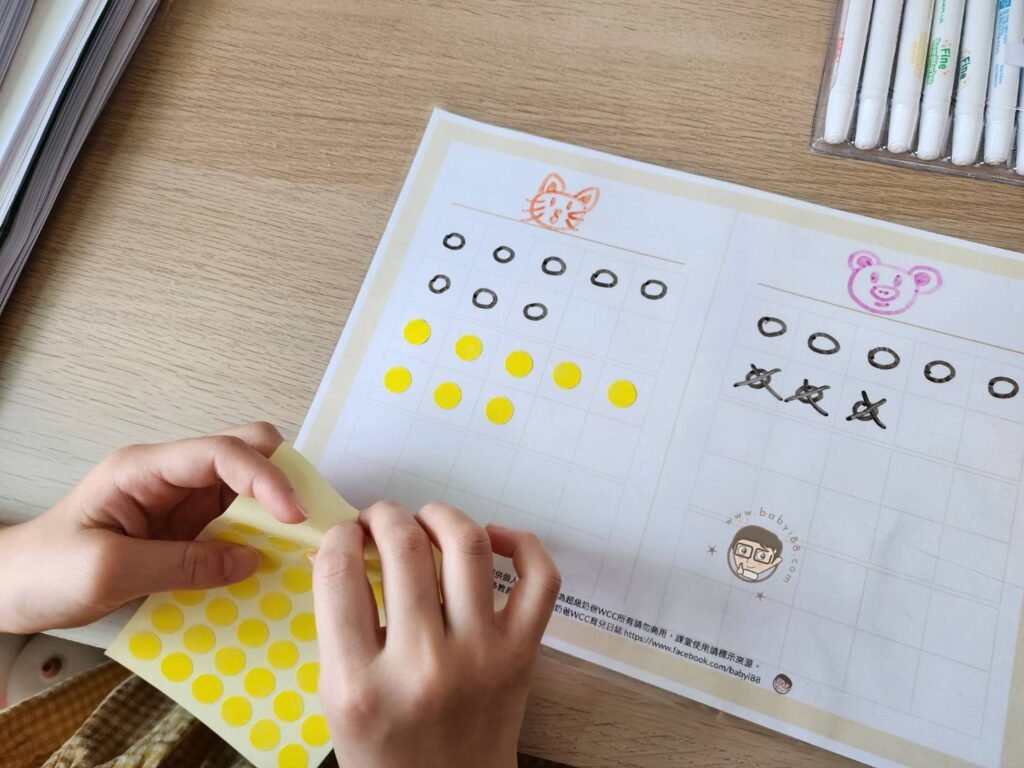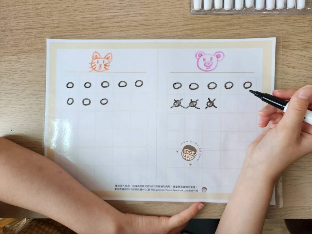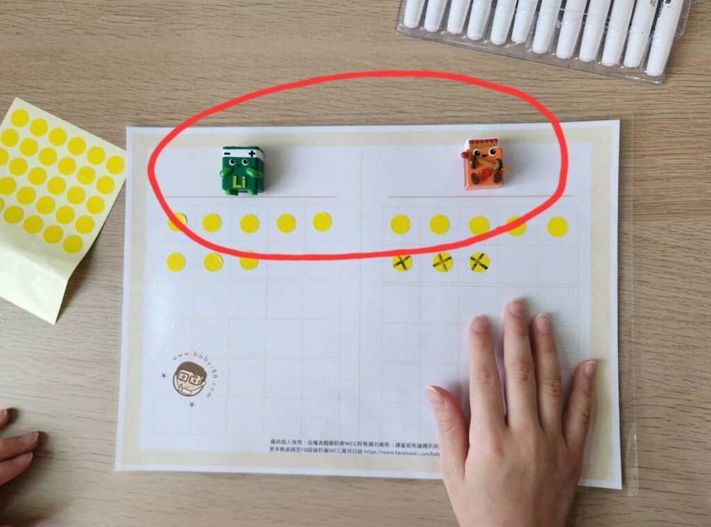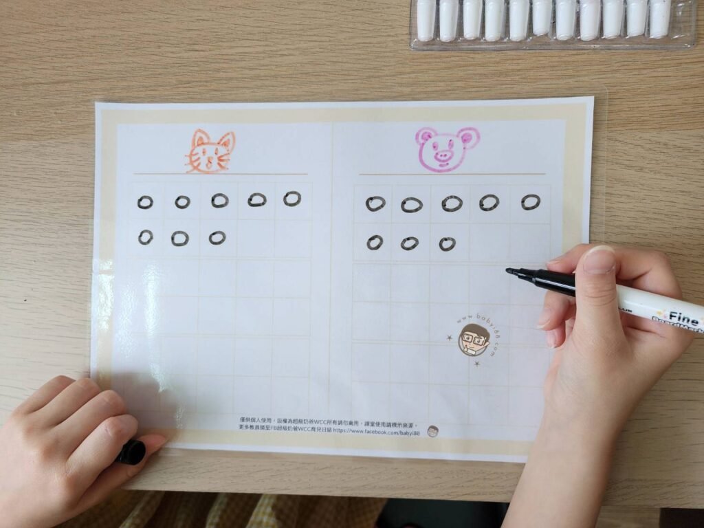 最近很多爸媽同步在問這一題減法應用題 『小鋰有8個橡皮擦,小磷比小鋰少3個,小磷有幾個橡皮擦?』 像這樣類似的題目孩子卡住的時候,別擔心,準備這一份學習單跟貼紙就可以幫小朋友快速搞懂這樣的數學應用題 學習單的下載連結放在文末,學習單可以護貝或是放入擦寫袋裡就可以重複使用 列印好就用簡單的小遊戲來解題囉~ 『小貓有8個橡皮擦,小豬比小貓少3個,小豬有幾個橡皮擦?』 題目的兩個角色分別寫/畫在左右兩個欄位(若要重複書寫,要用白板筆喔!) 小貓有8個橡皮擦,在左邊小貓欄位畫上8個圖形 小豬欄位也畫上一樣的數量 小豬比小貓少3個,刪掉3個後,數一數剩下5個重複操作幾次類似的題型,小朋友很快就會懂囉!   除了用書寫的方式,也可以請小朋友挑兩支最喜歡的公仔來當扮演題目角色 公仔分別放在學習單左右兩個欄位 搭配貼紙貼,貼的同時頭腦更能夠加深記憶,小朋友會覺得更好玩,增加孩子對數學的好感^^