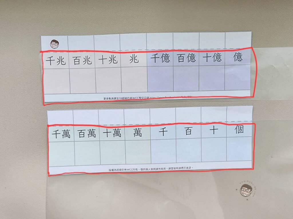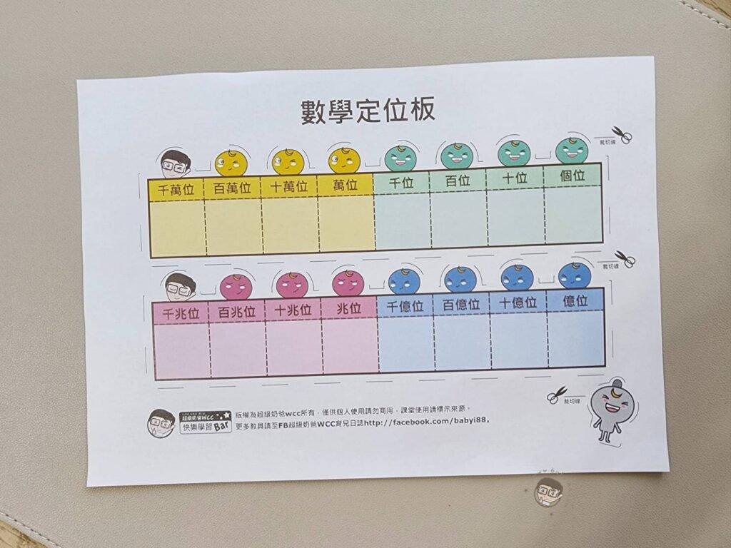定位板的設計每4位用用顏色區塊做區分,讓小孩一眼就可以清楚地將數字分組,不用從個為一個一個往前數,看到大數字不慌張,可以更快讀出數字