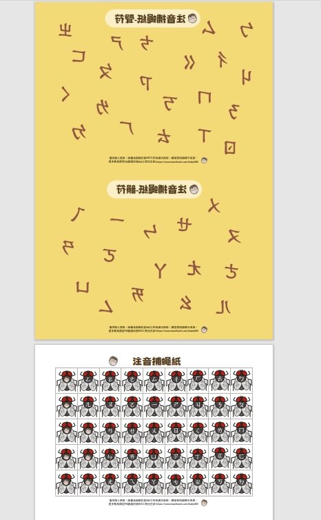 第1頁是注音捕蠅紙聲符,第2頁是注音捕蠅紙韻符,第3頁是注音福來(fly)