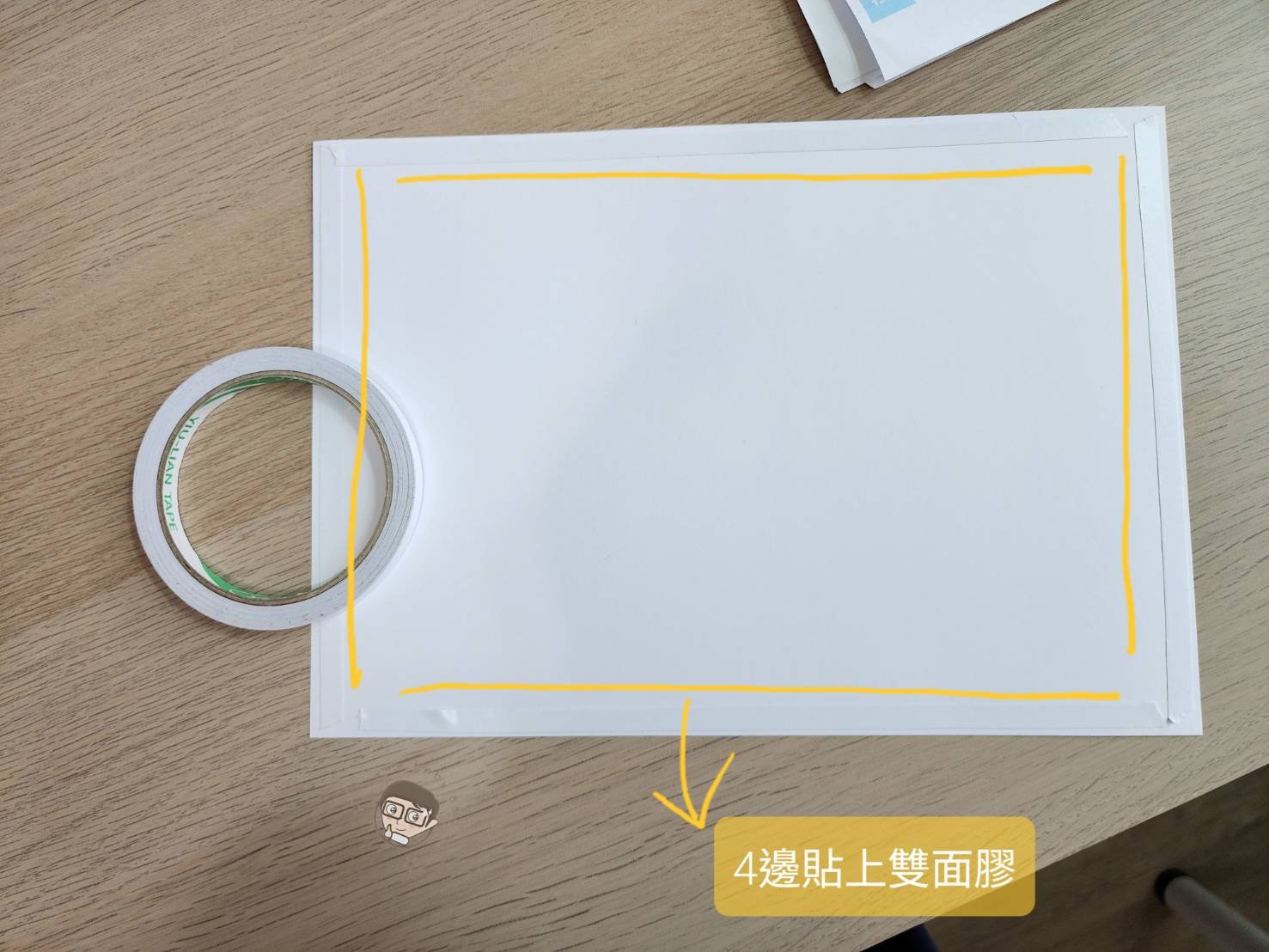 準備2張A4卡紙,卡紙4個邊貼上雙面膠