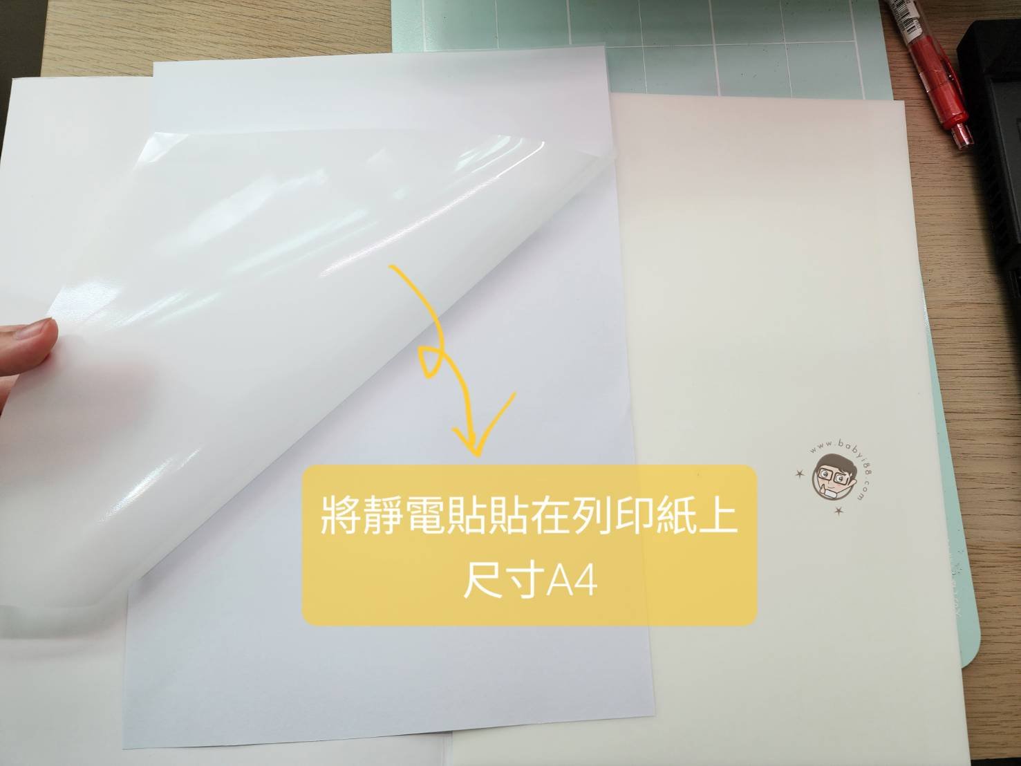 新型的靜電貼背面有滿版黏膠,撕下來貼在A4列印紙上,需準備2張