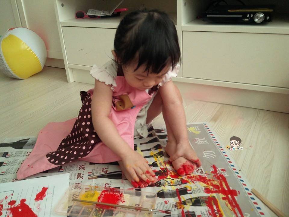 例如:1歲多玩顏料的姊姊,從玩顏料的行為投入發現姊姊對色彩及材料的興趣,11年後,現在的她是個色彩感知強的配色高手