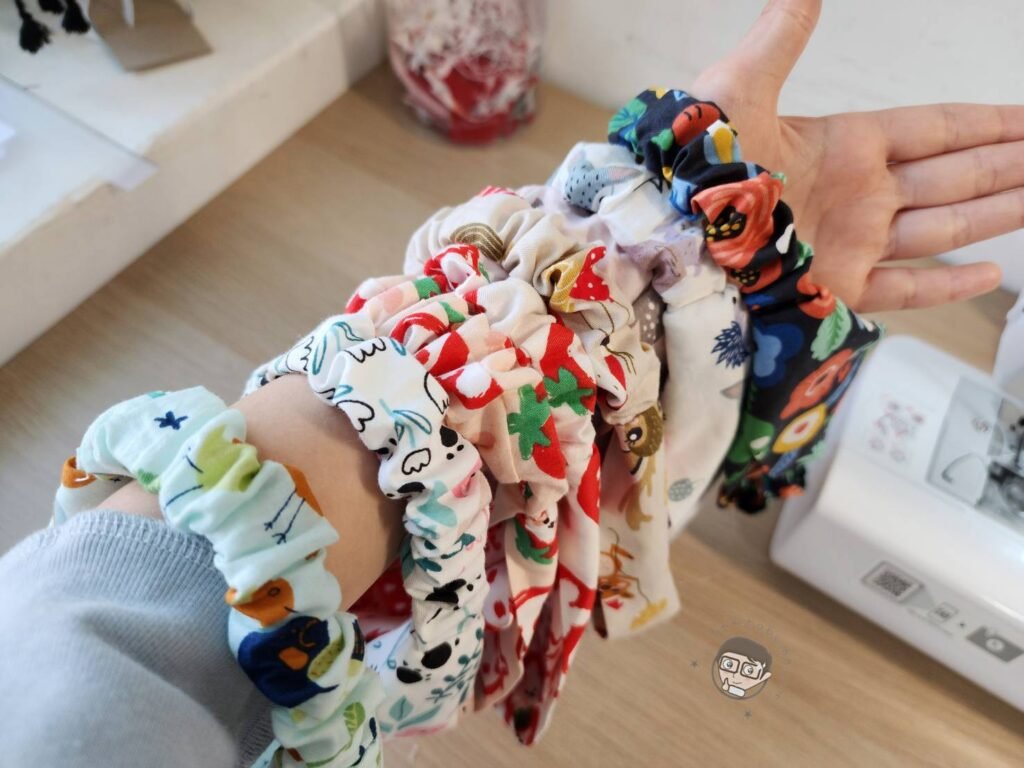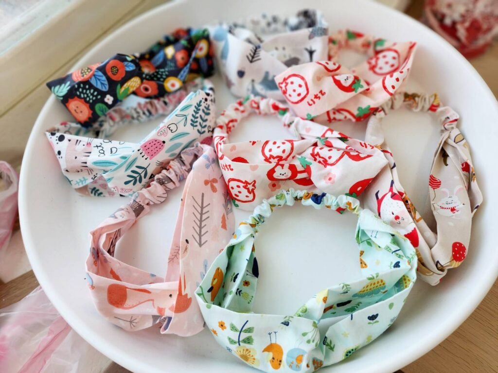 之前做大腸圈的布料還有剩,再來做成髮帶湊一對