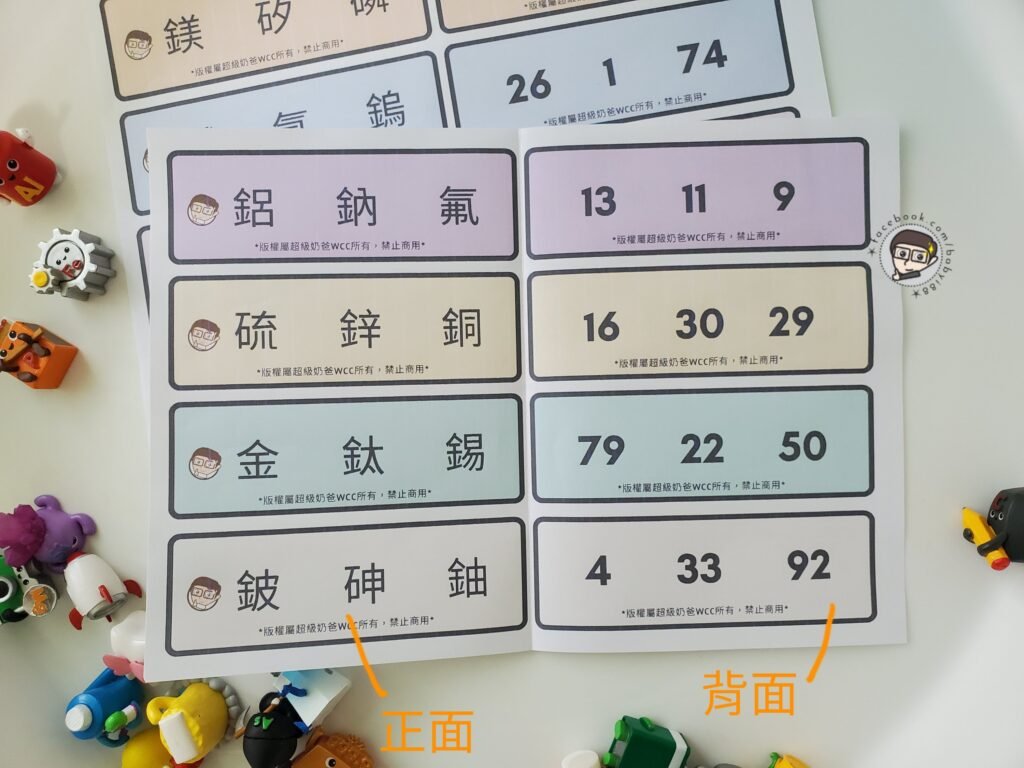 左邊設計卡片正面(元素的中文名稱),右邊設計卡片背面(元素編號)