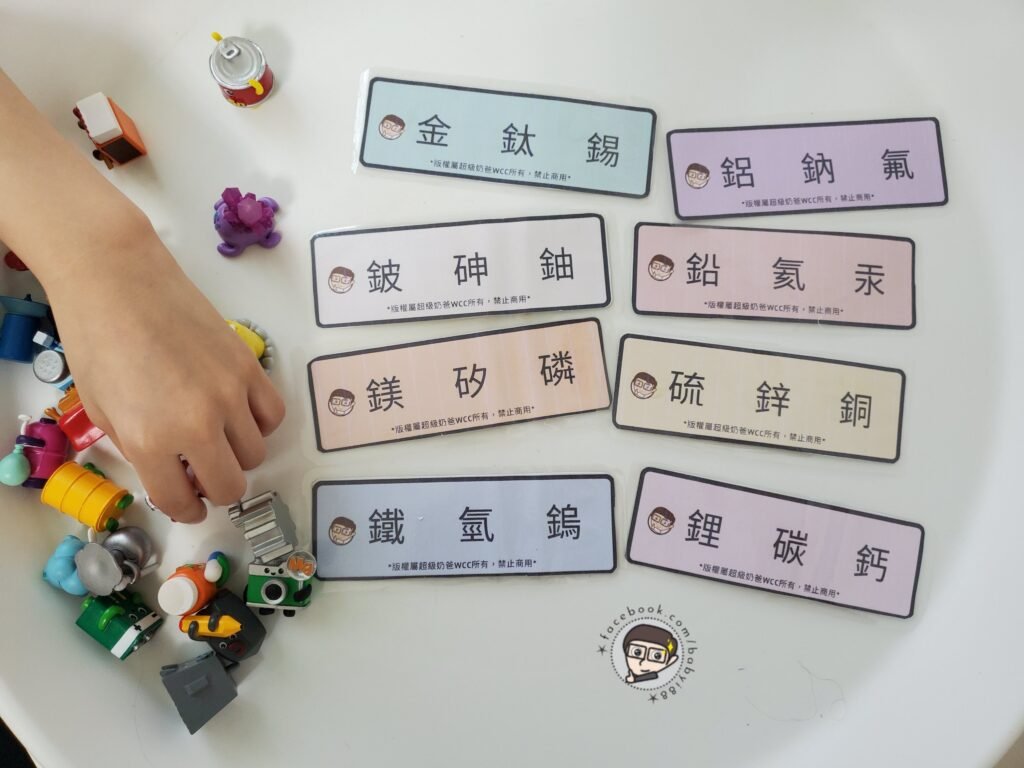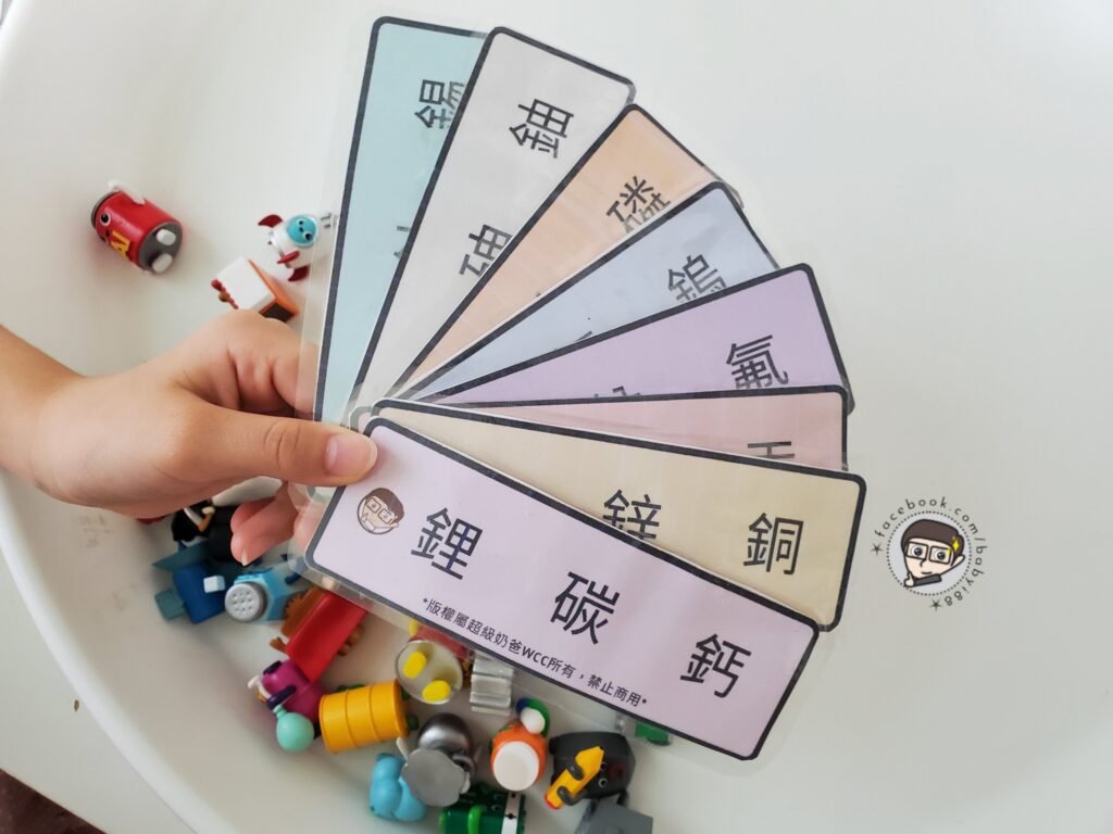 卡片上特地只寫上中文,讓小朋友在遊戲過程,自然而然將元素的中文跟英文做連結,不用死背,用遊戲的方式輕鬆記起來