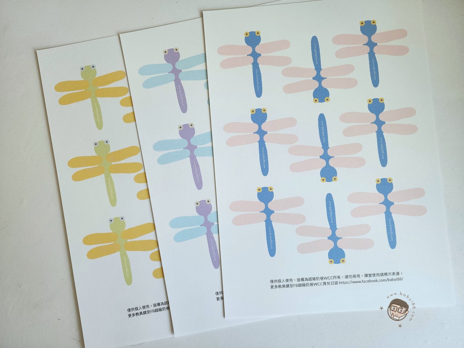 蜻蜓設計了3種顏色,可以用來做蜻蜓的分類,短母音,長母音,混合子音,特殊母音…等