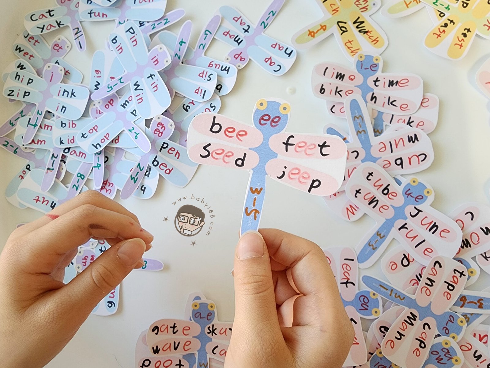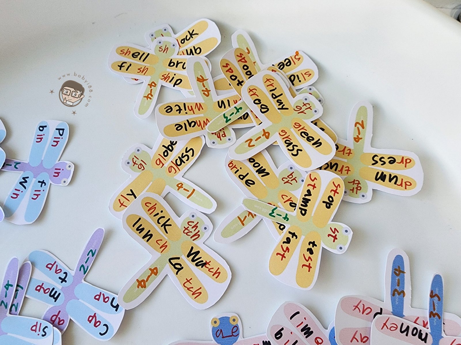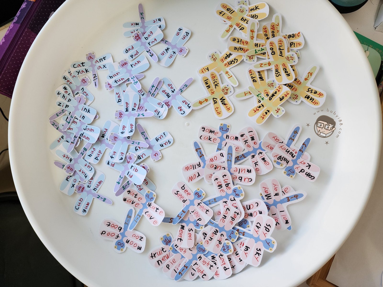 我們使用的教材大部分是一個發音搭配4個單字,所以這次的設計以蜻蜓為主題,讓英文的學習也可以很有美感
