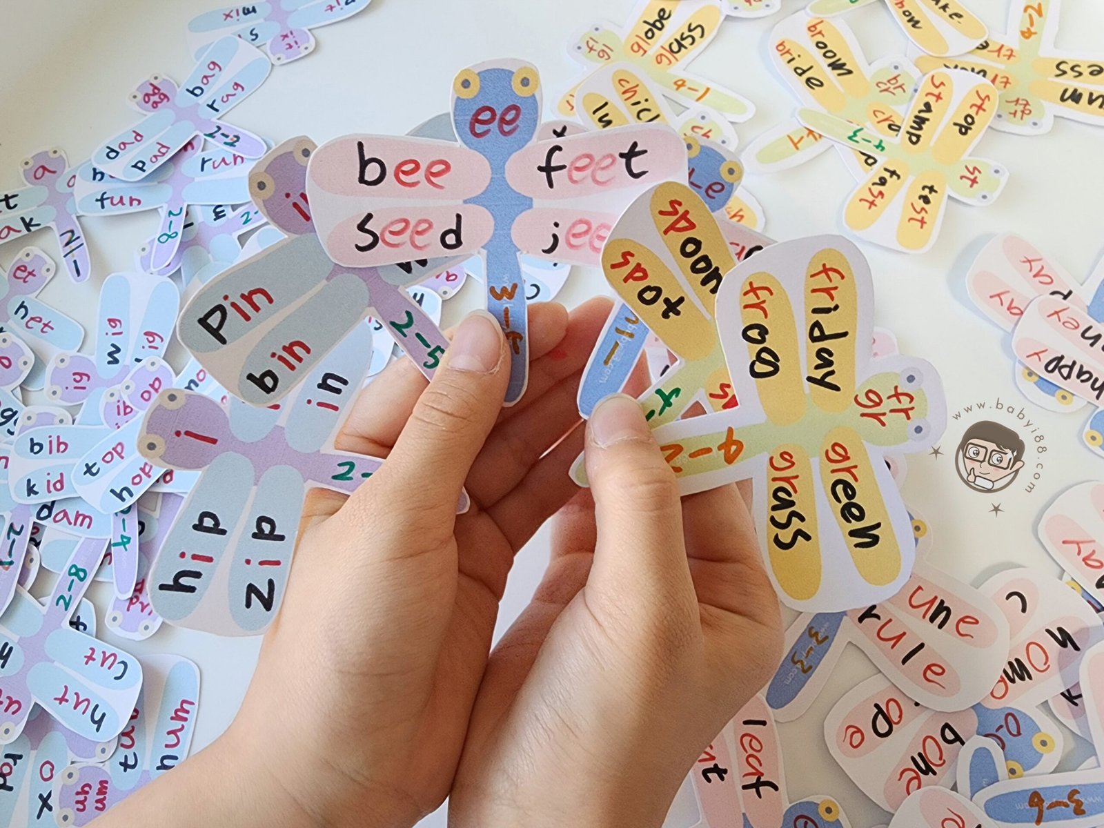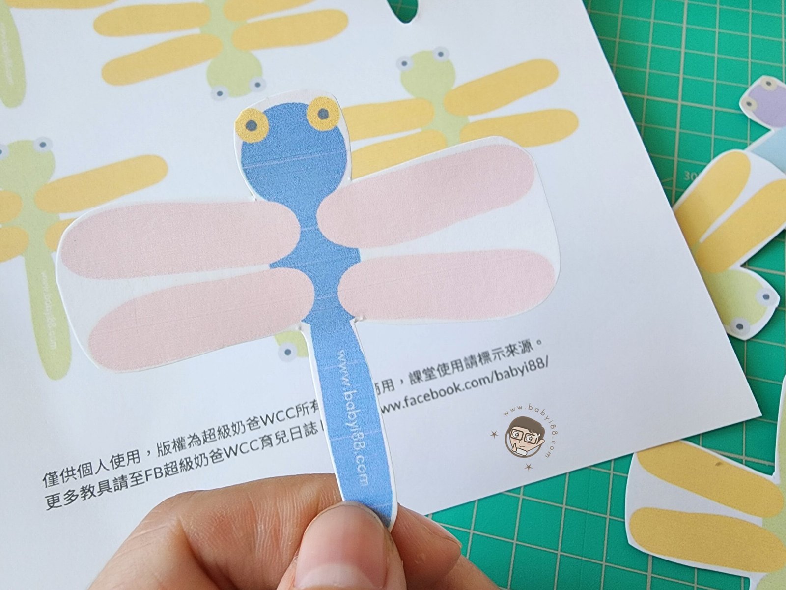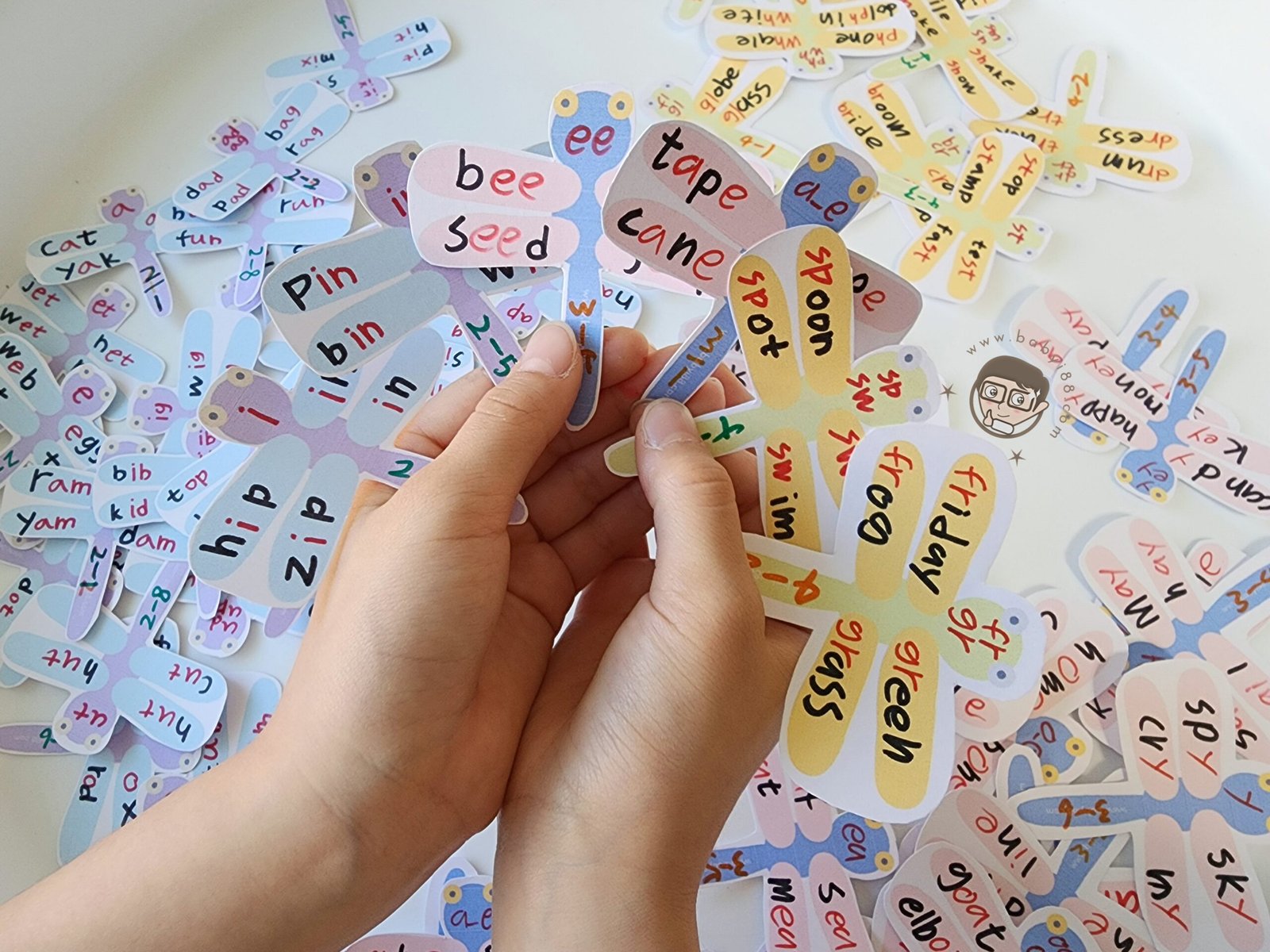 我們使用的教材大部分是一個發音搭配4個單字,所以這次的設計以蜻蜓為主題,讓英文的學習也可以很有美感